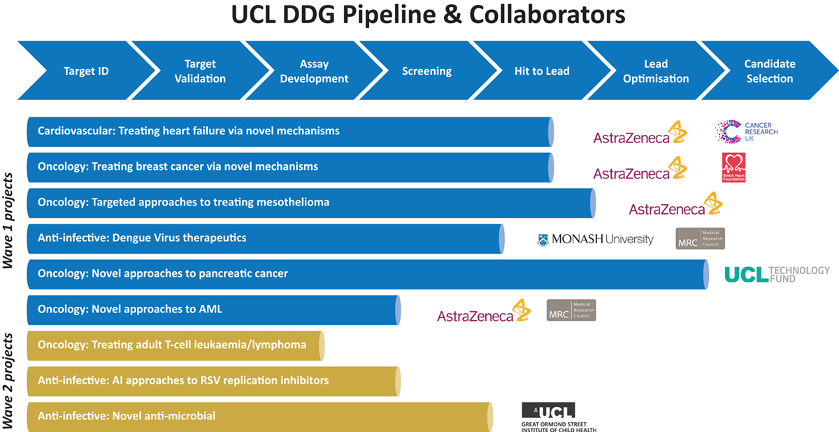 To date, the team has established a portfolio of projects (Wave 1) built upon UCL-based research (Figure). The primary focus has been the cardiovascular, anti-infective and oncology projects, many enabled by Open Innovation collaborations with AstraZeneca. Most of these projects have progressed to validated hit series and are currently seeking on-funding to enable further progression. A second wave of projects are continuing to mature and the team are establishing drug discovery approaches or confirming data associated with early tool compounds.