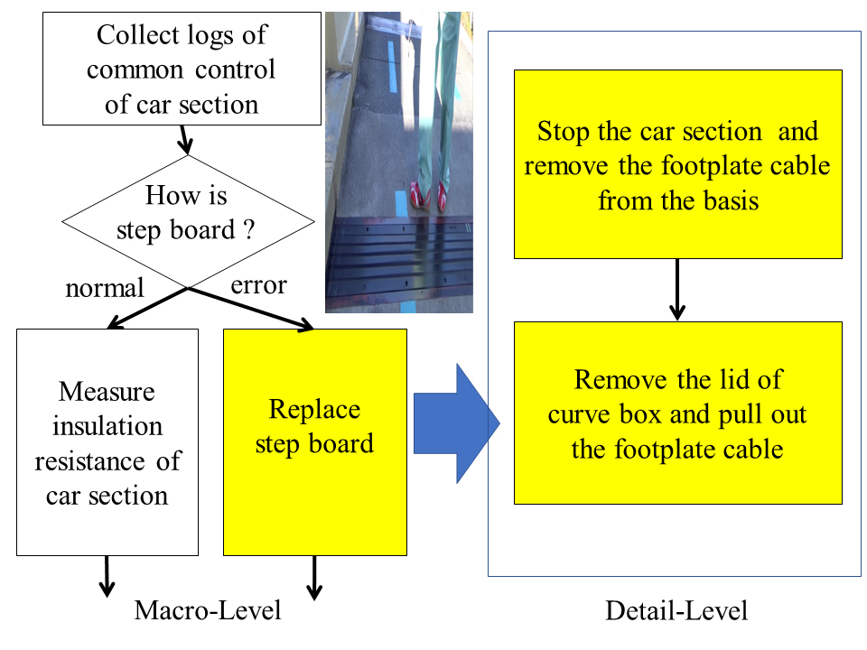 The workflow shows novice/beginner workers how the maintenance work process goes. It has two levels: macro-level and detail-level. Macro-level workflow presents the whole flow of maintenance work. Detail-level workflow decomposes macro-level work into detailed works. Figure 2 shows the macro-level workflow and decomposed detail-workflow.