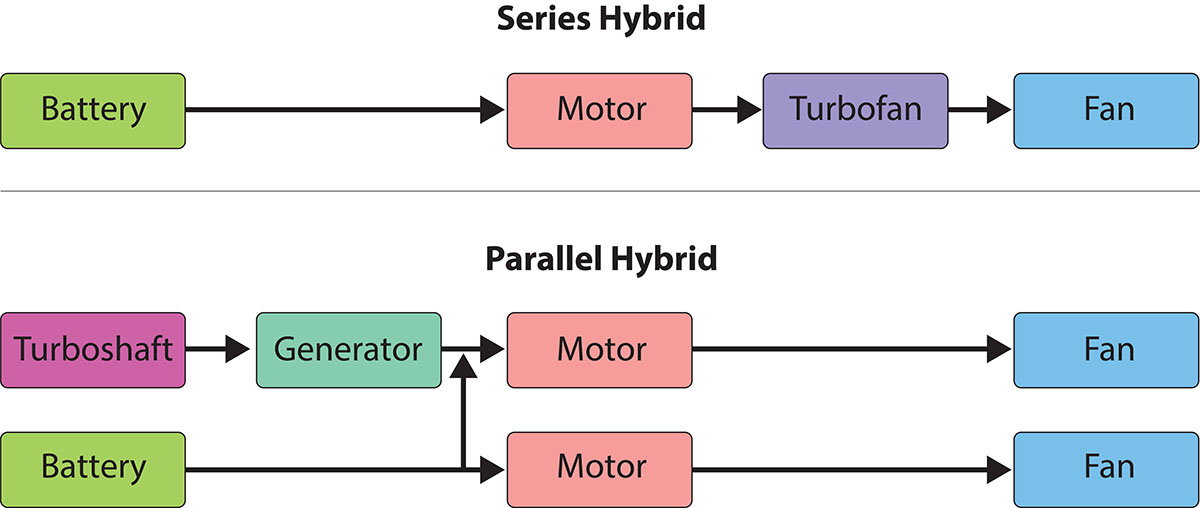 Nevertheless, as far as fossil fuel and carbon footprint reduction are concerned, this is almost certainly the best choice. Many projects are now taking this route: small aircraft equipped with full electrical propulsion, or, for larger ones, co-propulsive systems. Co-propulsion is a general concept combining electric-power and fuel-based power systems. It covers hybrid-electric engines architectures (Cf Figure) or turbo-electric ones (for which turbo-shaft generated energy is transformed into electrical energy to drive – possibly multiple – distributed electric motor-driven fan(s)).