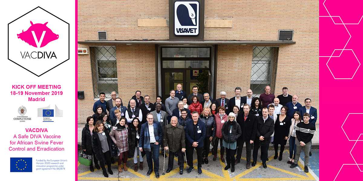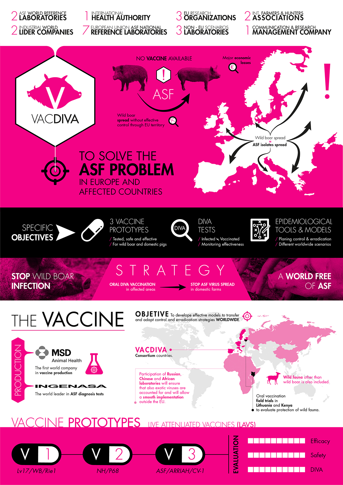 The EU-funded VACDIVA project (Gran Agreement No. 862874) has been financed with 10 million euros by the European Union (EU) to solve the ASF problem in Europe and other affected countries, providing a safe and effective vaccine(s) for wild boar and domestic pigs ready for registration. It will also develop DIVA (Differentiating Infected from Vaccinated Animals) test to allow accurate monitoring of the effectiveness of the vaccine. Finally, it will design control and eradication strategies in different epidemiological scenarios worldwide and test the pilot vaccine in real environments.