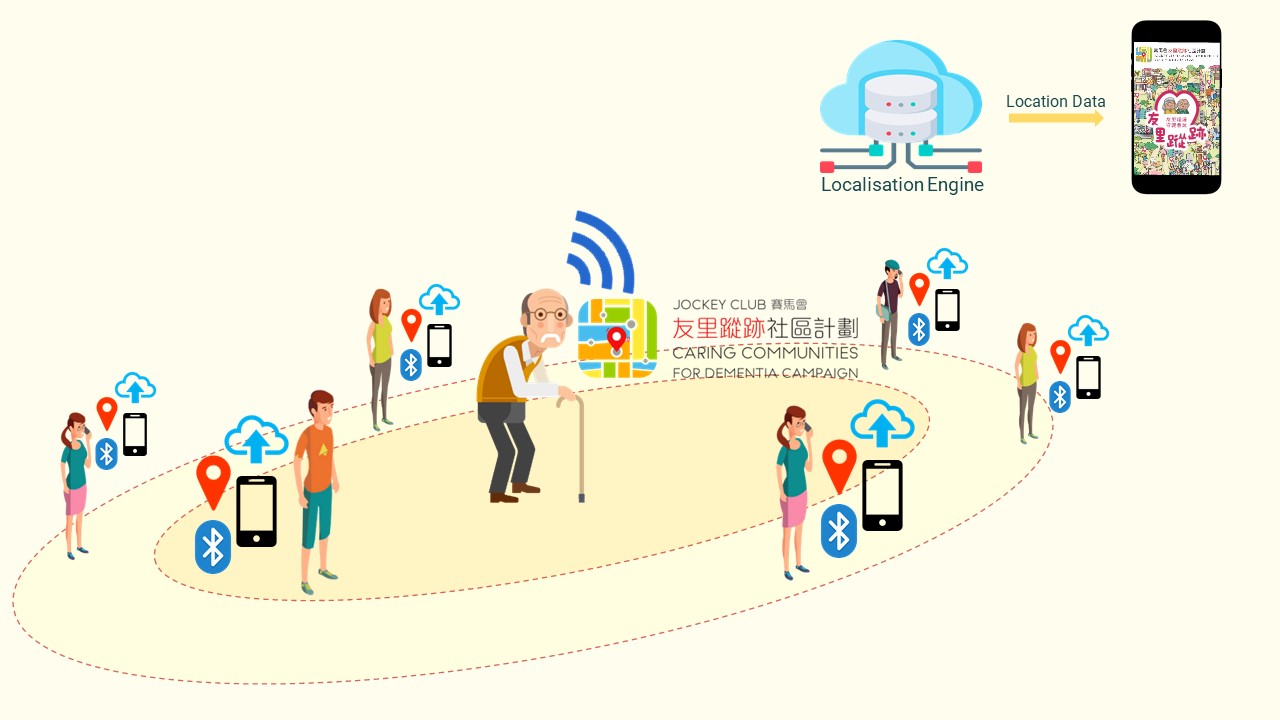 When the dementia angels’ mobile phones detect the iBeacon, their location would be anonymously sent to our cloud server and our localization engine would calculate the location of the iBeacon which would then be sent to the caregivers to help their searching. Such technology not only facilitates family caregivers’ search for the lost relatives with dementia but also promotes dementia friendliness community by mobilising the public to help older people with dementia who get lost.
