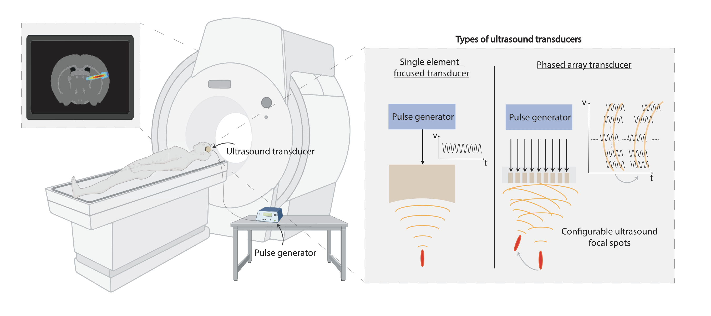 Low-Intensity Focused Ultrasound (LIFU) is an emerging neuromodulation method with disruptive potential since it allows for non-invasive stimulation across the whole brain with milimetre precision. At the core of this method is the generation of focused ultrasound waves, which are acoustic waves with a frequency larger than the human auditory limit of 20 kHz. By connecting a pulse generator to an ultrasound transducer coupled to an acoustic lens, an ultrasound beam can be transmitted through the skull and focused in a pre-determined brain location. To minimize the attenuation through the skull, the ultrasound frequency is normally set to the range of 500 kHz and 1 MHz, which defines the spatial resolution to the millimeter range, similar to the ultrasound wavelength.
