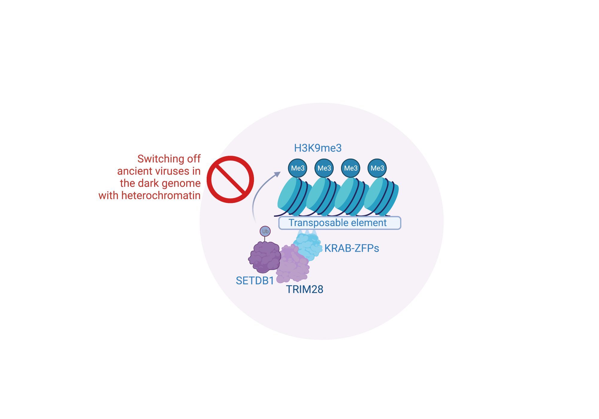 In previous work, we uncovered a critical host defence pathway involving TRIM28 and KRAB-zinc finger proteins (KRAB-ZFP) that targets and switches off the transcription of ancient viruses. This defence pathway operates at the chromatin level by recruiting an enzyme known as SETDB1, which is a ‘chromatin writer’ and lays down silent chromatin (heterochromatin) at nucleosomes surrounding ancient viral DNA. SETDB1 does this by adding a modification to histone tails of trimethylation at lysine nine on histone three (H3K9me3), an epigenetic mark associated with gene silencing. In our new studies, we have found that the TRIM28 pathway targets dangerous DNA sequences because they confer ancient viruses the ability to jump. This ensures that the ancient viruses which can jump are shrouded in heterochromatin and rendered harmless.