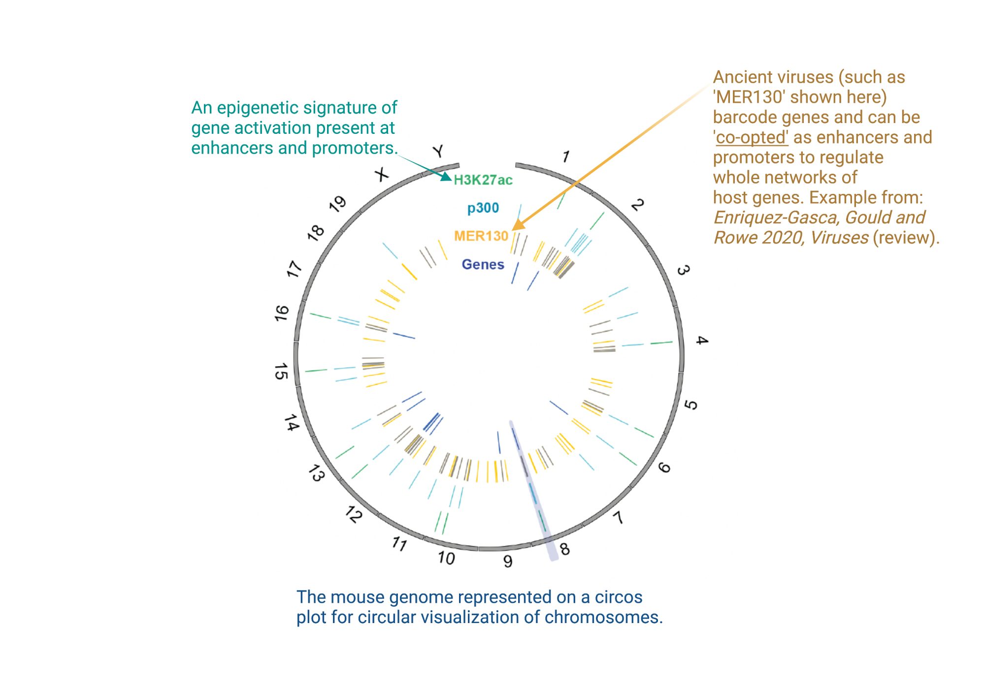 Our recent work has also shed light on which copies of ancient viruses in the genome get repurposed by the host to serve as regulatory elements: During the process of retrotransposition, ancient viruses copy or reverse- transcribe their RNA genome into DNA in order to replicate and integrate into new sites within the genome. This process can be error-prone and may lead to mutations and deletions of parts of their sequence along the way. Indeed, our research shows that if they lose their jumping capacity, they also lose vital sequences required for targeting by the TRIM28 pathway. This is because the TRIM28 path targets the very same strings of sequences vital for viral replication (jumping). This indicates that ancient viral copies need to lose their threat to be co-opted by the host as alternative promoters, enhancers and non-coding RNAs.