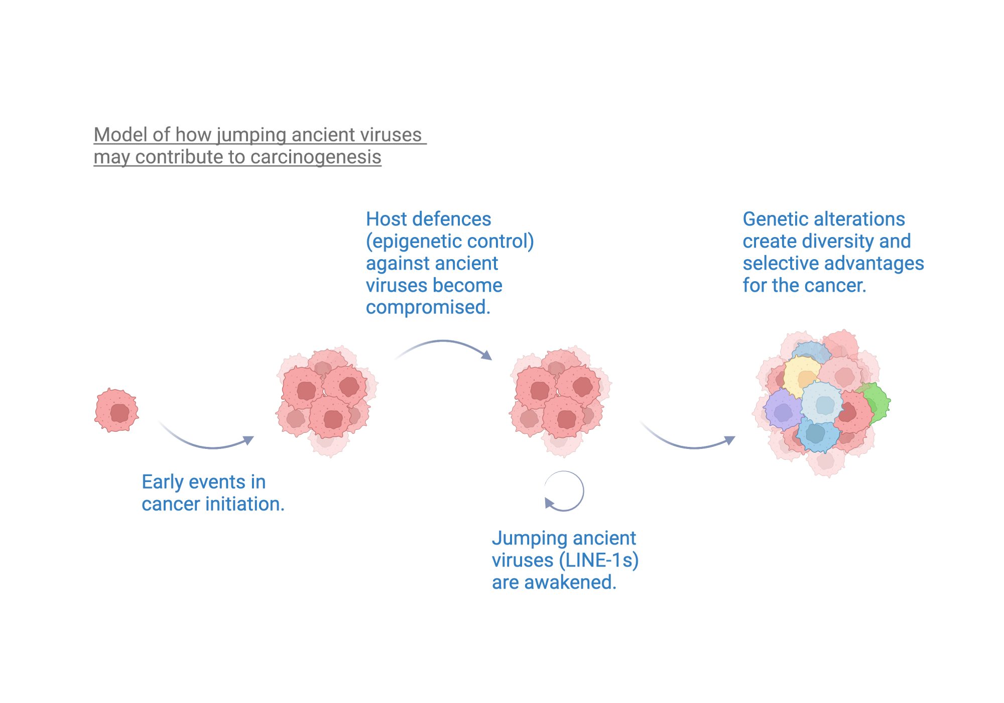 As introduced at the beginning of this article, cancer represents a unique disease context wherein multiple layers of host defences are disrupted. This in turn can lead to a loss of epigenetic control of our genomic burden of ancient viruses. This explains why recent research has highlighted an increase in the actual jumping of ancient viruses (from the LINE-1 type) across various human cancers. This jumping activity has been linked to causing diverse genetic alterations in cancers, including mutating tumour suppressor genes (which usually protect us against cancer). We hypothesize that jumping viruses also contribute to cancer evolution by creating increased genetic diversity. This then provides a platform from which groups of cancer cells (clones) can develop with selective advantages, for example, which gain the ability to evade destruction by the immune system. Further research will shed light on new molecular vulnerabilities that can be targeted to outwit cancer.