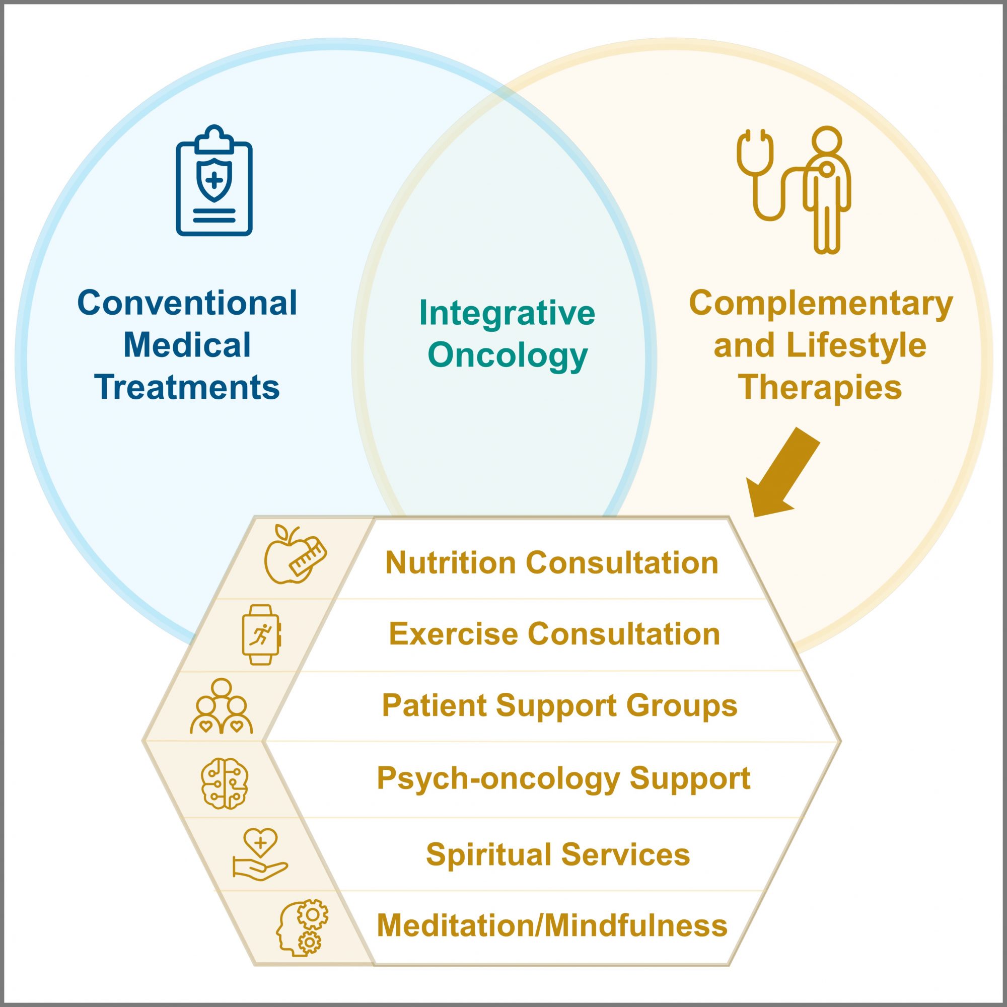 As defined by C.M. Witt et al in the Journal of the National Cancer Institute, integrative oncology is “a patient-centred, evidence-informed field of cancer care that utilizes mind-body practices, natural products, and/or lifestyle modifications from different traditions alongside conventional cancer treatments.” Patients can use numerous complementary and lifestyle therapies, which I will refer to as complementary therapies for simplicity. Some of the most common are nutrition and exercise counselling, psycho-oncology support (therapy), meditation/mindfulness, spirituality, patient support groups, yoga, massage, acupuncture, reiki, music or art therapy, and tai chi or qi gong. There are many other complementary modalities, but these twelve are a good representation of the needs of mind, body, and soul.