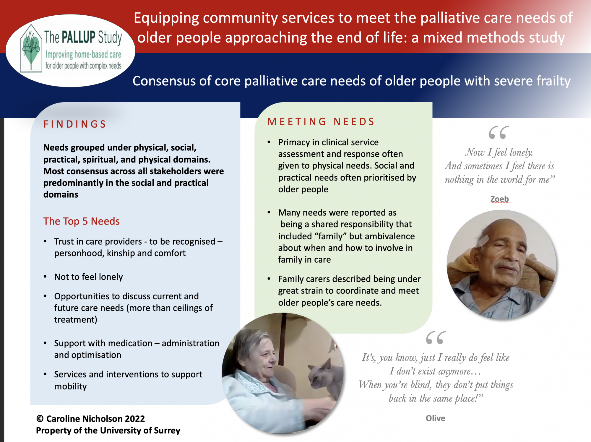 The HEE/NIHR funded PALLUP study evidences the specific end-of-life needs of older people with frailty and current service responses. This evidence will be translated with key stakeholders to develop a service framework and resources to support tailored care. A scoping review of published literature evidencing the perspectives of older people with MM supported a consensus exercise to gain agreement on the core needs of older people with frailty at end of life.