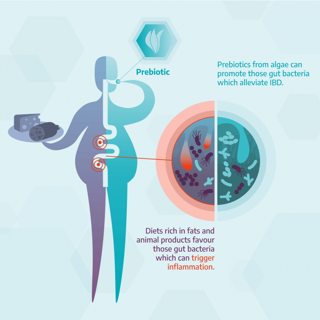 Over the past 25 years, the development of therapies that target components of the inflammatory process has transformed the treatment of IBD. Although many patients have benefited from these drugs, many others have failed to respond to treatment or have struggled with unwanted side effects. Biological therapies can also be expensive and, combined with the increasing prevalence of IBD, are a major driver behind the growing economic burden of IBD on healthcare providers. Consequently, there is now an urgent need to identify alternative, food-based interventions to alleviate the impact of IBD. In a recent review article, researchers from the Algae4IBD project highlight how an imbalance in gut bacteria can contribute to the development of IBD and discuss the recent evidence supporting the use of probiotics and prebiotics as a treatment strategy.