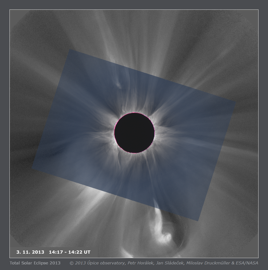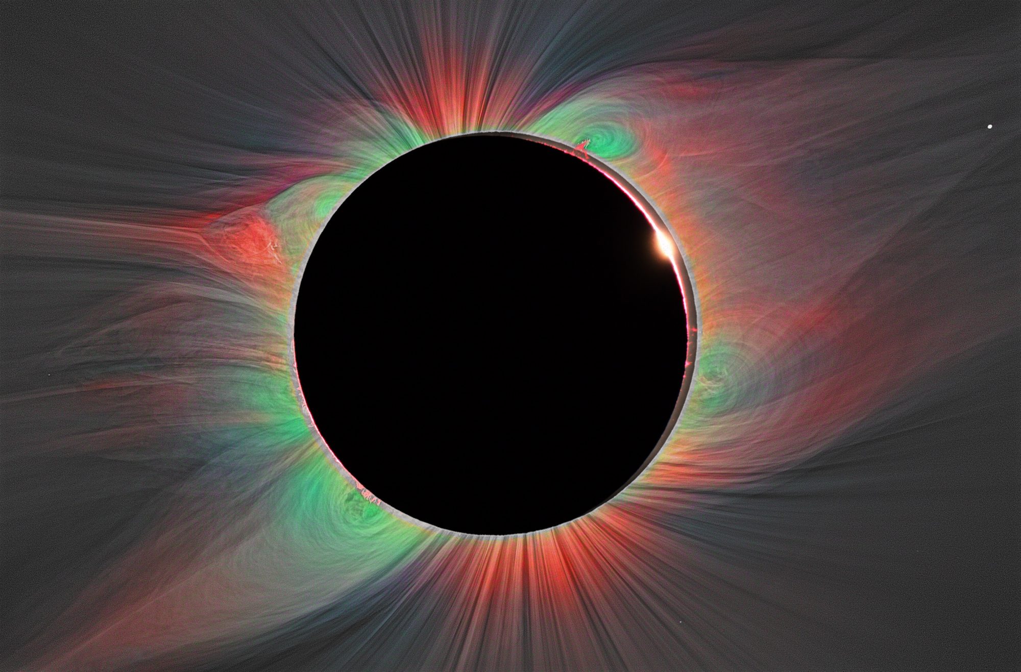 Another striking feature in Figure 2, is the presence of a large prominence (pinkish hue emission in the upper right corner), enshrouded by Fe13+ (green) emission. The fact that cool prominences at 104 K co-exist with the hottest plasma (Fe13+) in the corona, is a dichotomy that was discovered during eclipse observations and remains unsolved (see Habbal et al. 2010, 2014). The first observational link between prominences and CMEs was captured during the 3rd November 2013 total solar eclipses (Druckmüller et al. 2017). Shown in Figure 3, this image was the first to demonstrate how an erupting prominence forms the core of a CME (the large light-bulb shaped bubble in the bottom of the figure), while remaining tethered to the Sun.
