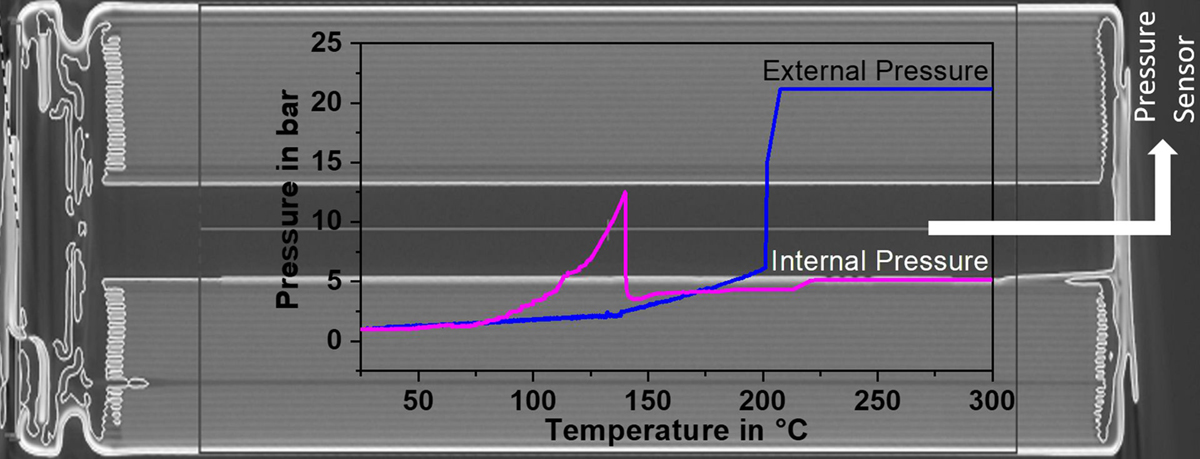New methods for the measurement of external and internal cell pressures for early prediction of thermal runaway of LIB have recently been established on 18650 cells. The external pressure was measured utilising a gas-tight cylinder inside the calorimeter chamber, in order to detect the venting of the cells, as can be seen in the blue curve in Fig. 2. For internal pressure measurements, first an X-Ray tomography image was recorded to find a suitable place. Then a pressure line connected to a pressure transducer was directly inserted into the cell and the pressure was recorded during a thermal abuse test, as can be seen in Fig.2 in the curve coloured in magenta. This plot clearly shows that the cell goes into thermal runaway even if the safety vent opens at a pressure of around 12 bar and releases gases leading to a pressure drop. Thus, the measurement of the internal pressure could be used for the early prediction of processes leading to thermal runaway. This method has been adapted from cylindrical cells to pouch cells and prismatic automotive cells.
