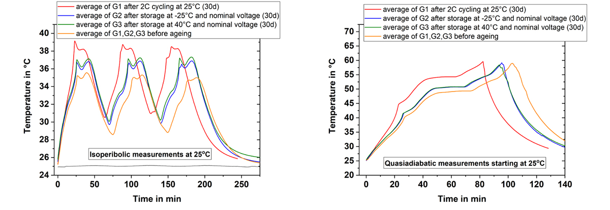 Isoperibolic means, that the temperature of the calorimeter chamber is kept constant and the temperature change at the surface of the cell is measured. In the quasiadiabatic mode the heaters in the calorimeter chamber follow immediately any change of the cell temperature preventing the heat transfer to the chamber. Using these two conditions an ageing study was carried out. First, fresh cells were stored at different temperatures in temperature chambers and then characterised at fixed time intervals in order to investigate the influence of this storage (calendar aging) on cell performance. Secondly, cells were aged at a constant charging/ discharging rate in temperature chambers (cyclic aging).