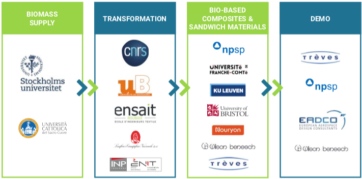 SSUCHY’s consortium covers the overall value chain: it starts from the biomass supply, followed by the transformation processes step related to plant fibre reinforcement on one hand, and biobased polymers on the other hand, up to the design and manufacturing of actual composites & sandwich materials and finally, the prototyping of products.