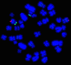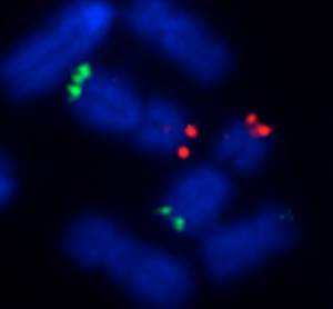 However, karyotyping is labour-intensive, it requires pig-specific expertise and does not allow identification of the very smallest (‘cryptic’) translocations. To overcome these drawbacks, here at the University of Kent, we have established a new service called ‘CytoScreen Solutions’. At the core of this service, is a method we have developed to solve the inherent problems of karyotyping in a rapid, accurate and cost-effective manner. We use an innovative adaptation of a technique known as ‘FISH’ (fluorescence in situ hybridisation). With this new method, we can identify even the smallest of translocations (as demonstrated in the figure).