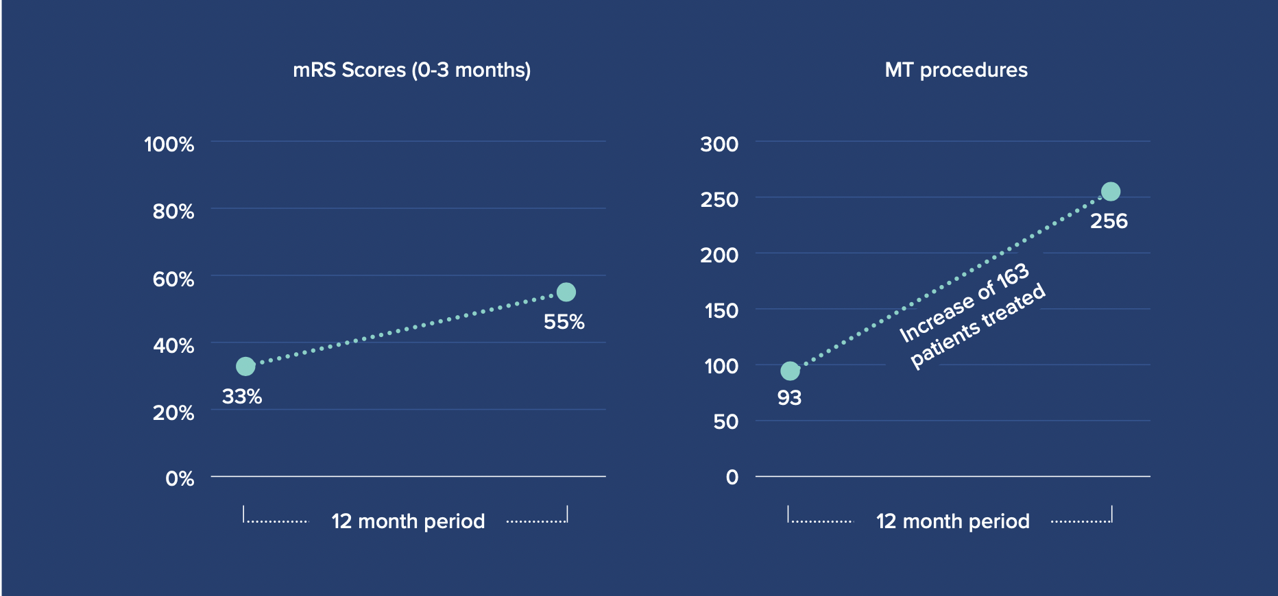 Patients admitted to Ipswich eligible for mechanical thrombectomy are transferred to the Royal London Hospital (RLH), a comprehensive stroke solutions centre in Whitechapel that serves as a supraregional thrombectomy hub for Ipswich and a number of other stroke units across the Southeast of England. RLH are the epicentre of the largest stroke AI network in the UK, serving over 9 million patients. Post implementation of Brainomix e-Stroke, mRS scores (0-3 months) increased from 33% to 55% within 12 months and continue to show an upward trend. MT procedures increased by an additional 163 patients in the same period, totalling 256, making it the one of the busiest MT centres anywhere in the UK.