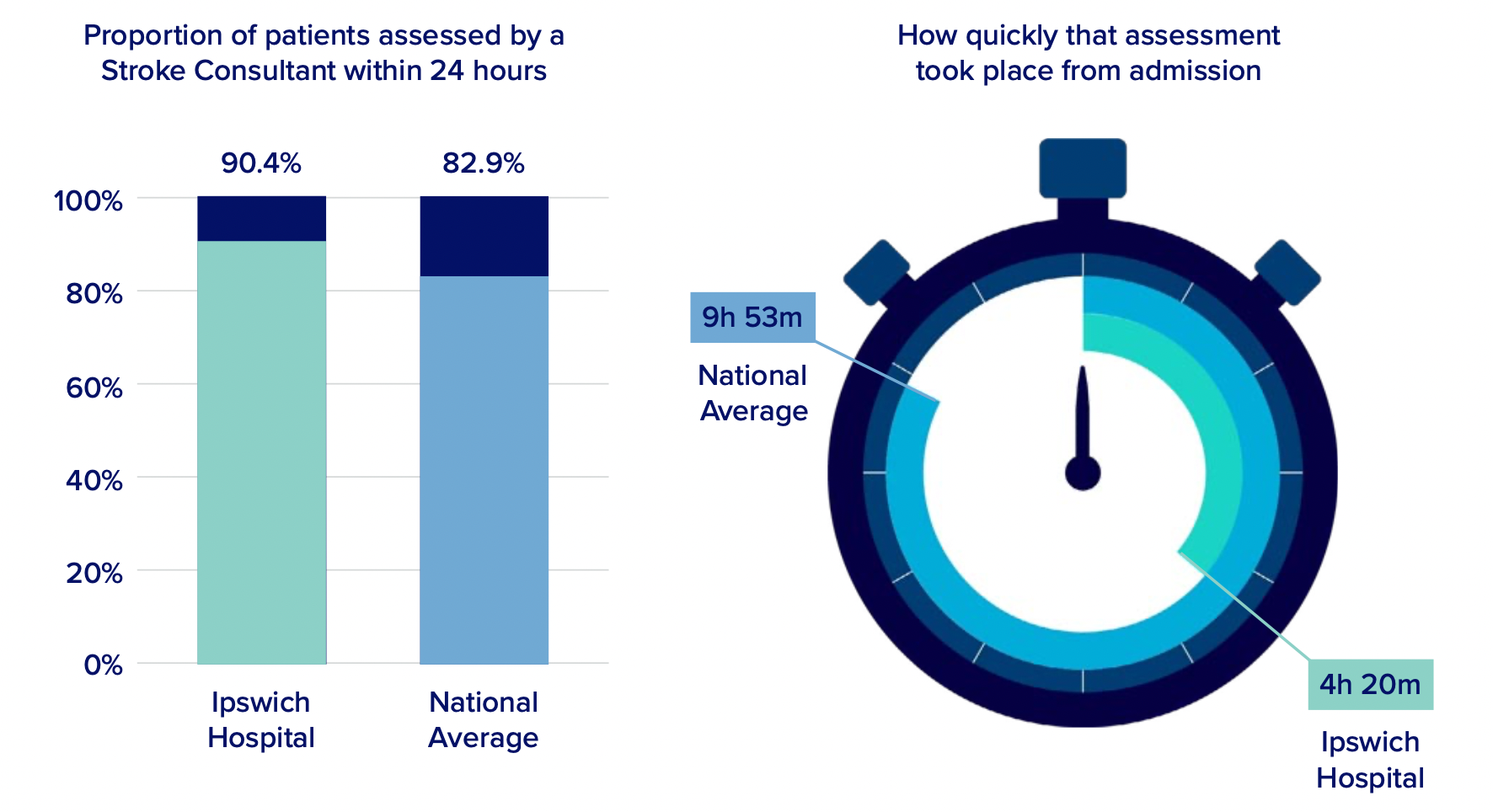 Recent performance metrics indicate that Ipswich continues to deliver best-in-class service, with their proportion of patients being assessed by a Stroke Consultant within 24 hours above the national average (90.4% vs 82.9%), along with how quickly that assessment takes place from admission (4 hours 20 minutes compared to 9 hours 53 minutes nationally).