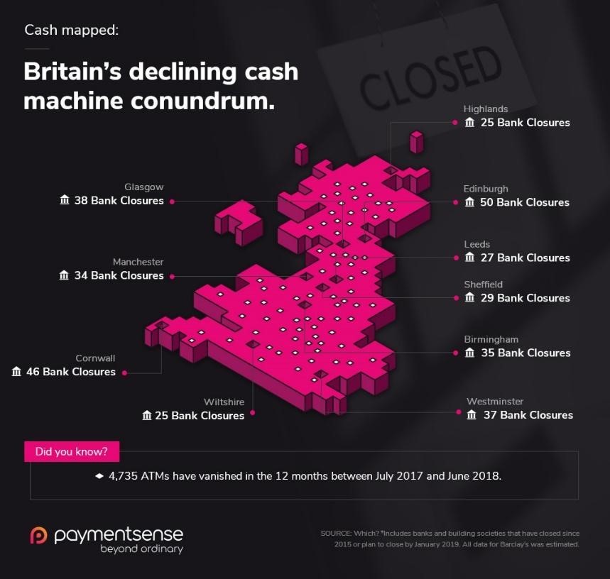 Data from Statista shows that across the UK no less than 4,735 ATM’s have vanished in the past 12 months, which averages out at 394 cash machines closing every single month.  Paymentsense have created an infographic that visualises the number of cash machines that have been closed over the past year, which can be seen here.