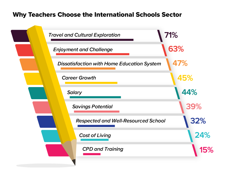 Perhaps unsurprisingly, a desire for ‘Travel and Cultural Exploration’ tops the list of reasons teachers choose to work in the international schools’ sector, at 71%. This is followed by the prospect of ‘Enjoyment and Challenge’ (63%.)