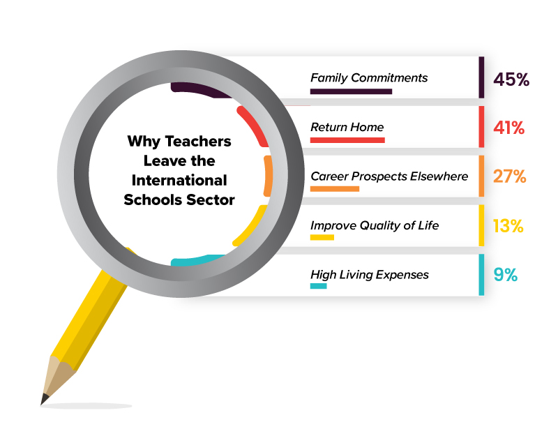 Comparably, Teaching Abroad Direct found the reasons teachers might leave the international schools’ sector and return to the UK to be led by ‘Family Commitments’ (45%) and simply a desire to ‘Return Home’ (41%.)