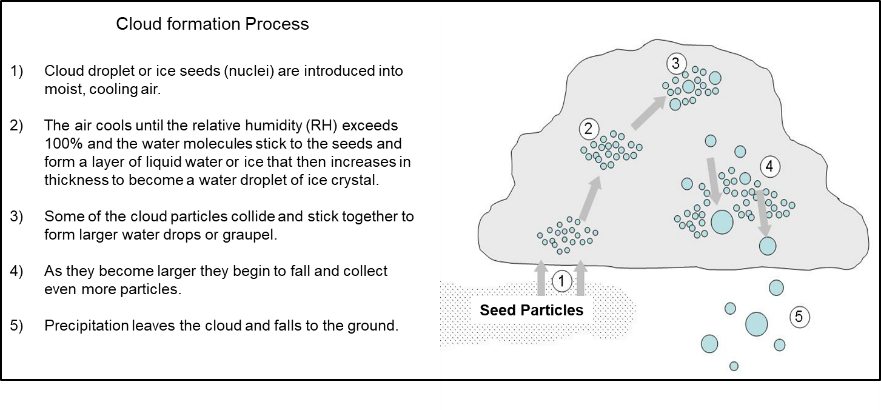 The physics behind the formation and growth of individual cloud particles is well understood. Theoretical formulations of the formation of water droplets or ice crystals on small aerosol particles, referred to here as seeds or cloud particle “nuclei”, have been verified with extensive laboratory and cloud chamber experiments. The necessary ingredients are these nuclei, a humid atmosphere and a mechanism for cooling the air until the humidity exceeds 100%. The annotated diagram shows a simplified cloud formation process.