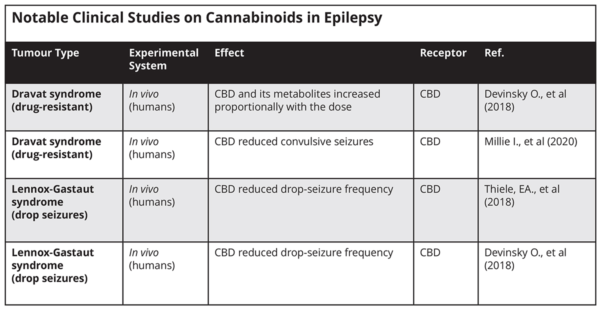 A double-blind placebo-controlled study, published in Lancet in 2018, investigated the efficacy and safety of CBD added to a regimen of conventional and anti-epileptic medication to treat seizures in 171 patients with treatment-resistant Lennox-Gastaut syndrome (LGS). The medium percentage reduction in monthly drop-seizure frequency from baseline was 43.9% in the CBD group versus 21.8% in the placebo group9.