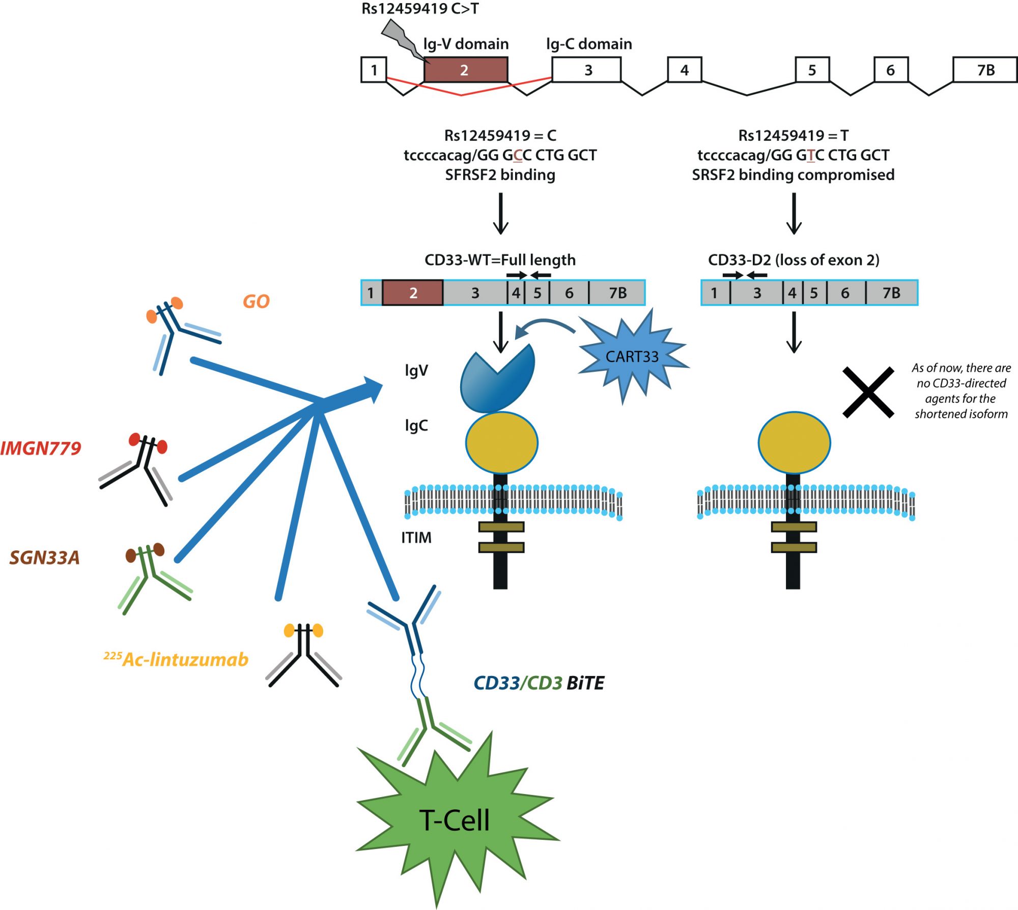 In our group, we have described genetic polymorphisms in CD33 that may be related to the response of GO.15 Through our studies, we have identified rs12459419 (C<T; Ala14Val) as a critical regulator of response. Located in exon 2, rs12459419 is a coding SNP present within four base pairs of the intron/exon junction and impacts the exonic splicing enhancer binding site for SRSF2 resulting in skipping of exon 2. The shorter CD33-isoform (D2-CD33) lacks the IgV-domain due to alternate splicing. Loss of the V-set antibody binding domain has two significant implications: it appears that most (perhaps all) available diagnostic antibodies are directed at the V-set domain, thus carriers of the T allele for rs12459419, would appear to be CD33 negative due to the lack of inclusion of the V-set domain. More importantly, loss of the V-set domain would directly affect the binding, internalisation and clinical efficacy of CD33-directed therapeutics. Altogether, these results suggest that loss of IgV domain due to presence of the splicing SNP compromises GO efficacy and, similar to expression levels, CD33 genotype can be used as a means of stratification to decide patients who will benefit from regimens including CD33-directed therapeutics.