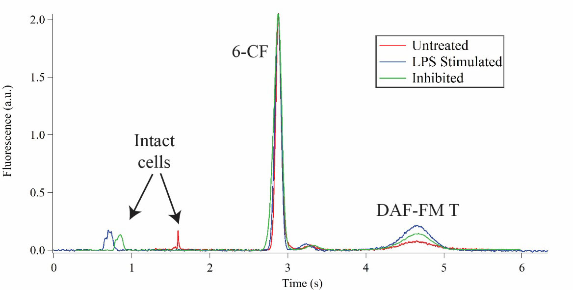 Beyond correctly identifying separated intracellular analytes, it is perhaps more important that our device can detect changes in NO levels in response to inflammatory stimulation, as well as inhibition of iNOS. To test our system’s capabilities for this application, we measured NO levels in immortalized T lymphocytes (Jurkat) to serve as a model immune cell. An inflammatory response was elicited using lipopolysaccharides (LPS) which mimics a bacterial infection. An increase in the peak area of the DAF-FM T peak relative to 6-CF indicates elevated NO production. To measure the effects of inhibition, we chose a potent and selective iNOS inhibitor, 1400W dihydrochloride. The cells were treated with both LPS and 1400W dihydrochloride followed by NO measurements. Representative single-cell measurements for untreated cells, stimulated cells and inhibited cells are shown in an overlay in Figure 3. Cells stimulated with LPS produced 2.2-fold more NO as compared to untreated cells, and cells treated with the inhibitor only increased NO production 1.2-fold.