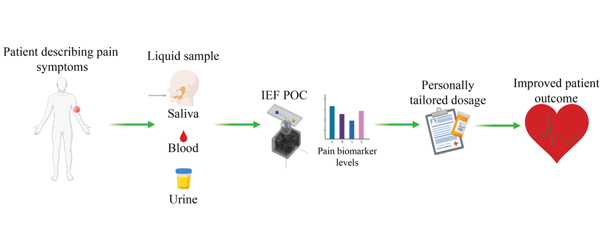 Figure 1. A workflow outlining the clinical usage of the IEF point-of-care device to improve the patient outcome by tailoring the dosage of painkillers based on the levels of pain-associated biomarkers (e.g. MMP-2 and MMP-9). Created with BioRender.com