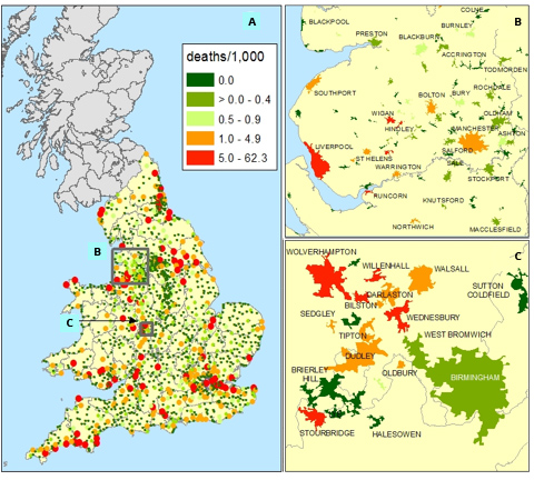 In London, then a world leader in piped water and flush toilet technologies, cholera mortality was 5.9 deaths per thousand population. The port city of Liverpool experienced even higher mortality, of 11.3 deaths per thousand. However Manchester and many of the booming textile towns of Lancashire experienced relatively light mortality (panel B), and Birmingham escaped all four cholera epidemics virtually unscathed, despite its position as a major transport hub for canal and road transport, and its negligible provision of piped water (panel C). By contrast, the mining districts adjacent to Birmingham experienced some of the highest cholera death rates recorded.