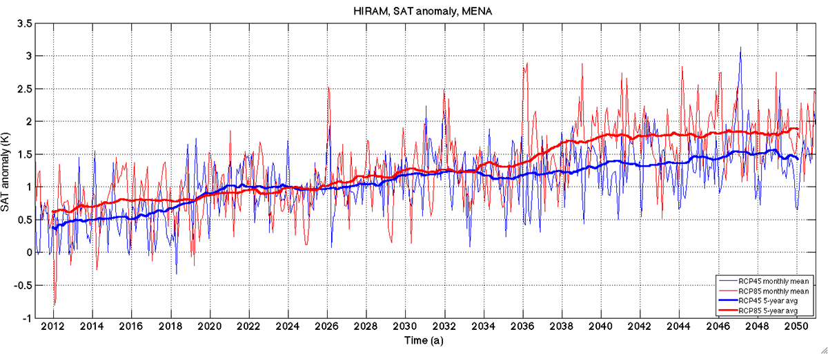 The Middle East experiences an enhanced level of warming in comparison with the average warming trend over the Northern Hemisphere. One of the reasons is extreme dryness of the region that prevents the land surface energy balance adjustment by increasing evaporation. Therefore, the desert temperature sensitivity to radiative forcing, solar and longwave, is higher than that averaged over the global landmasses. The highest warming trend is observed in Summer making temperature extremes more severe. Fig. 1 shows the temperature projection in MENA until 2050 for two IPCC emission scenarios RCP8.5 (red, business as usual) and RCP4.5 (blue) with decreasing of CO2 emissions starting from 2030. This assessment was conducted for the United Nations Economic and Social Commission for Western Asia (UN ESCWA) project on water resources and social vulnerability in Arab countries. The projections were calculated on a KAUST supercomputer using the global high-resolution atmospheric model (HiRAM) with a regional spatial resolution of 25×25 km2. The results show steady warming for more than 1 K by the middle of the 21st century.
