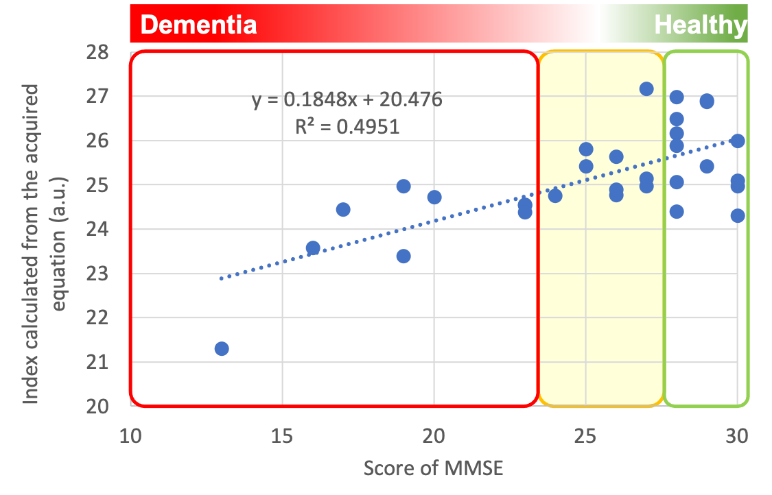 Based on a MMSE, it was found that a score of 23 points or lower indicates possible dementia, while a score from 24 to 27 suggests mild cognitive impairment (MCI). As the figure shows, the index prepared demonstrates good judgment capability in the normal range of 28 points and higher and the suspected dementia range of 23 points and lower. In the normal and suspected MCI range, judgement was difficult — as presented at the 40th International Conference of the IEEE Engineering in Medicine and Biology Society (EMBC2018).