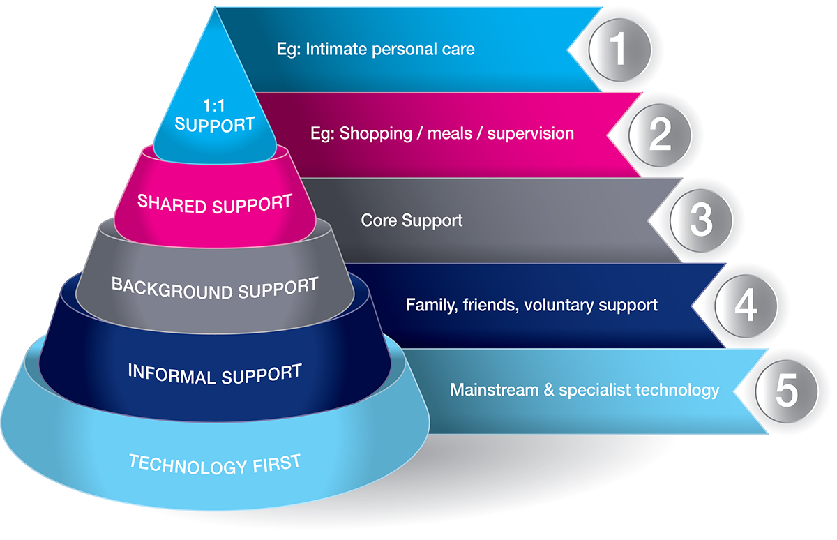 iESE offers support to its user base in the form of training and user forums to help them get the best from the tool. As part of this it has designed a hierarchy of needs table (see graphic) to assist users when commissioning care. It aims to avoid the default position of opting for one-to-one support by working through a table of other potential solutions first. This could both reduce the hours of care commissioned and help the client retain independence – an important consideration of The Care Act.