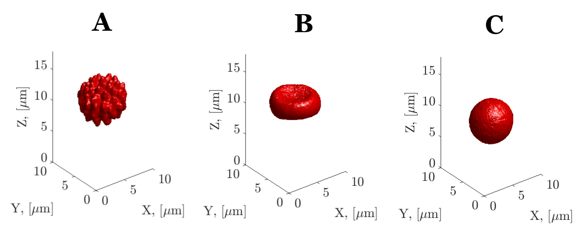 We also study the biological mechanisms behind heterogeneity in red cell shapes and properties. These tests will be then implemented in a new prototype of a microfluidic device that will be used for automated cell shape analysis. This device will address hydration state, deformability and membrane stability of individual red blood cells. Information on the physiological and pathological “meaning” of red cell shape preferences and heterogeneity of cell shapes will be then implemented for the development of the algorithms for red cell shape analysis and its interpretation for clinical applications.