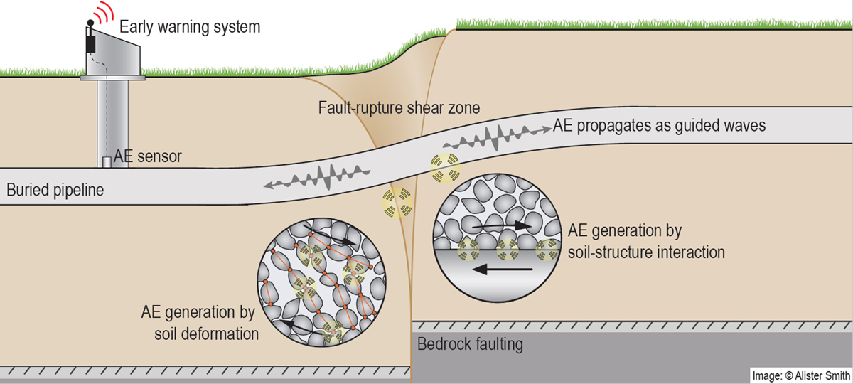 AE is generated in soil bodies and soil/structure systems through a suite of mechanisms including: inter-particle friction; particle contact network rearrangement (e.g. the release of contact stress and stress redistribution as interlock is overcome and regained); the degradation of particle asperities; particle crushing; and friction at the interface between the soil and structural element.