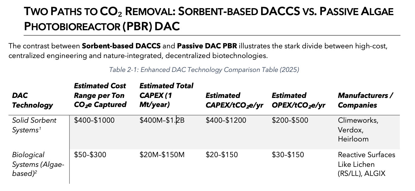 We examine the performance of high-cost, infrastructure-intensive solid sorbent systems such as Heirloom’s DAC facilities, alongside a next-generation, modular, nature-integrated approach represented by Passive Algae-Based DAC systems developed by Reactive Surfaces and Like Lichen (RS/LL).