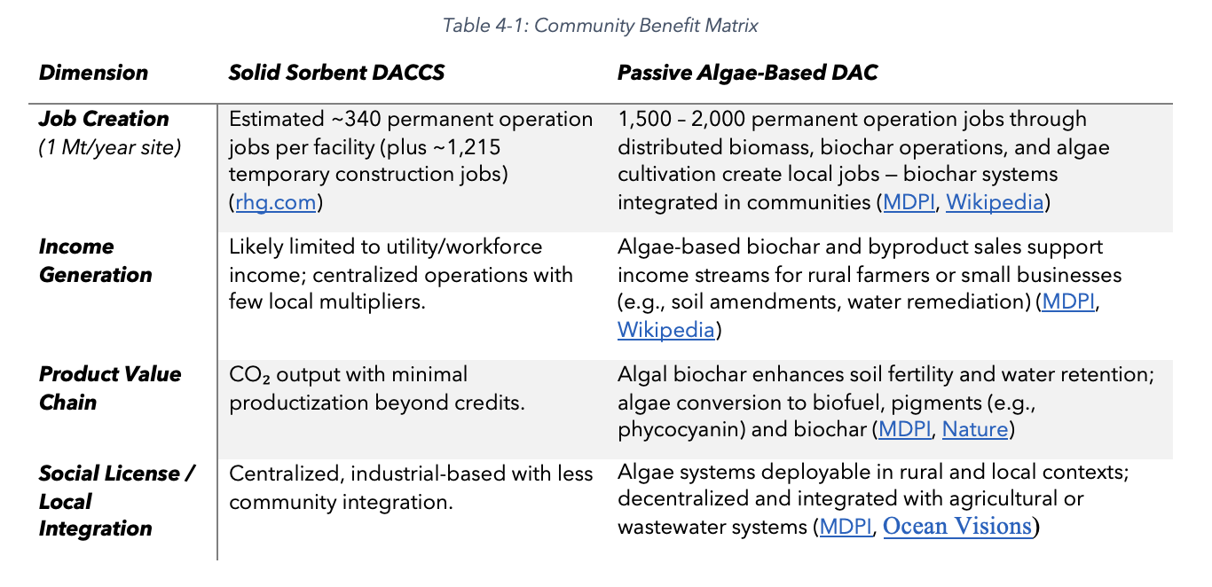 Sorbent-based DACCS represents a bold but capital-intensive, limited-impact approach to DAC. The Passive Algae Photobioreactor (PBR) DAC offers a low-cost, high-value, community-driven pathway to carbon removal with embedded co-benefits. The future of carbon removal must be: