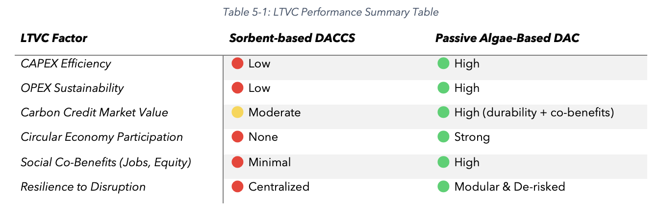 Table 5-1 below distils the core economic and operational performance criteria of competing DAC technologies into a comparative LTVC framework. It clearly illustrates that Passive Algae-Based DAC outperforms high-cost alternatives, such as sorbent-based DAC systems, across key metrics, reinforcing that economically viable, socially integrated, and resilient systems are a more strategic path forward for achieving scalable and sustainable climate impact.