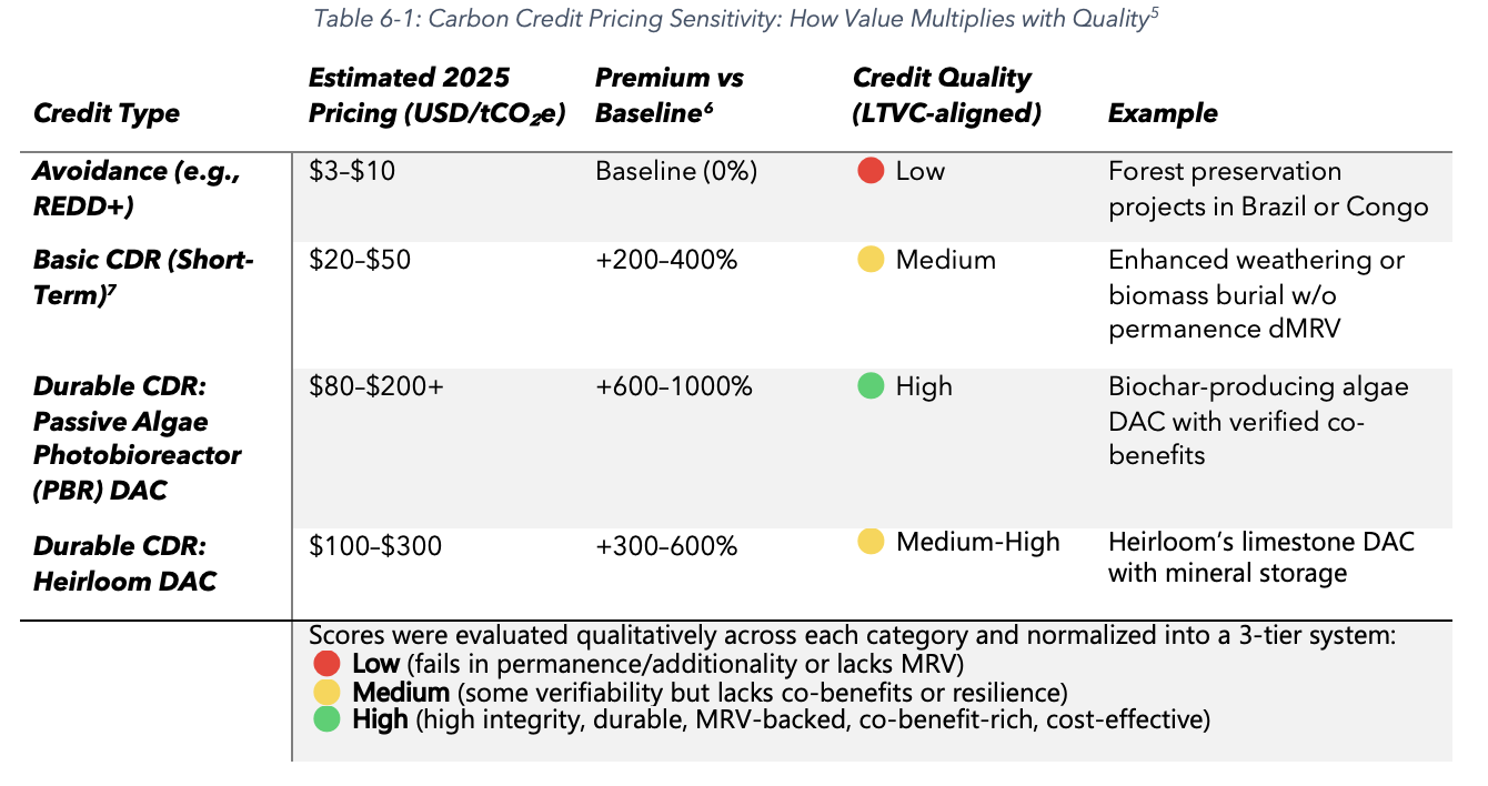 Furthermore, Table 6-1 below illustrates how carbon credit pricing is directly tied to credit quality, permanence, and co-benefits, providing a market-based rationale for investing in higher-integrity CDR solutions. It supports the economic argument that technologies like Passive Algae-Based DAC, which deliver durable and multifaceted benefits, can command significantly higher credit prices — thereby enhancing financial viability and investor returns.