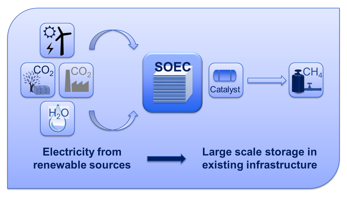 SOEC is the youngest of the electrolysis technologies, its costs are too high currently and must be reduced. This can be realised through the improvement of the performance of SOEC units and by an increase in the lifetime of the technology. These are two of the main goals of the European project, ECo (Efficient Co-Electrolyser for Efficient Renewable Energy Storage, grant number: 699892). The concept of the ECo project aims to combine electricity and existing gas infrastructure through high-temperature electrolysis to store and distribute green electricity efficiently, and at a large-scale.