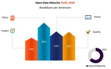 In terms of policy maturity, an overall maturity of 82% was achieved in the EU28 in 2018, indicating the EU Member States have developed a solid foundation in terms of their Open Data policy frameworks. Against this solid foundation, countries are now setting new focuses: less mature Open Data countries chose to take the natural next step and focus on modernising their national portals; the more advanced Open Data countries have now shifted to actions to increase the quality of data publication. In Europe’s top performing countries, such as Ireland, Spain and France, the focus is on monitoring and capturing the impact derived from Open Data reuse.