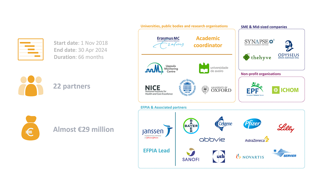 The European Health Data & Evidence Network (EHDEN) project, funded via the Innovative Medicines Initiative (IMI), is the largest of its kind in Europe working in the domain of RWD/RWE. Running from 2018-2024, it is a public-private partnership consortium of 22 partners, led by Erasmus Medical Centre (EMC) and Janssen. EHDEN is working to create an open science community symbiotic with the Observational Health Data Science and Informatics (OHDSI) global framework to facilitate observational/RWD-based research at scale and acceleration, without impinging on quality.