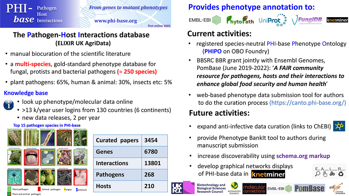Manually curated information from ~3,500 research articles is accessible to researchers to easily familiarise themselves with relevant molecular and biological facts on pathogenicity, virulence and effector genes and their 1st host targets. Nine species neutral, high-level phenotypes are used to describe the overall experimental interaction outcomes enabling comparative analysis of different pathosystems. The phenotypic data in PHI-base can be directly traced to the individual gene entries within the genomes of > 300 plant pathogenic species available within specialist genome databases including ENSEMBL invertebrates and FungiDB. PHI-base adheres to the FAIR principles and is a member of the UK node of ELIXIR’s ‘Data for Life’ project, where it supplies gold-standard agricultural–genomics data.