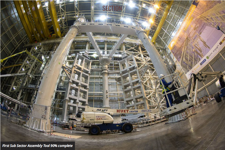 Europe, Russia and the United States, will fit snugly into the case. When finished, the component will be received at the ITER worksite in southern France, where an 800-tonne, Korean-made assembly tool – standing 10 stories tall, arms outstretched like a mechanical angel’s wings – will cradle it gently, together with a European-made sector of vacuum vessel and a Korean-made ultra-thin silver-plated thermal shield; and will slowly, ponderously merge the pieces together to form a single, unified tokamak section.