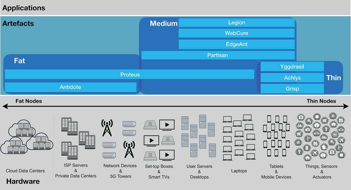Globally dominating companies in the IT sector are working hard to enable edge computing. Examples of cloud frameworks extended towards the edge are Microsoft Azure IoT, Amazon IoT Greengrass, and Google Firebase. Other companies have created consortia and defined edge computing architectures. One of the major consortia is the Industrial Internet Consortium, which has recently absorbed the OpenFog Consortium. The Industrial Internet of Things Volume G1: Reference Architecture (IIRA) defines a spectrum from cloud to sensor devices and a service-oriented approach for building applications on this spectrum, based on a layered structure with node-level services (network, compute, storage, etc.) on the bottom and application support services on top. However, in the fast-evolving world of edge infrastructures, the IIRA leaves many important aspects underspecified, such as the problems of data management, heterogeneity, security, multiple stakeholders, and so forth. The LightKone project addresses these aspects.