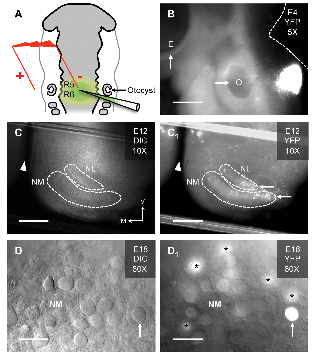 (A) Schematic of electroporation in the hindbrain of a Hamburger Hamilton (HH) stage 12 chicken embryo. The injection pipette is filled with plasmid DNA and fast green dye for visualisation of the injected hindbrain (rhombomeres 5/6 [R5/R6]). In this study, a plasmid that coexpressed the gene-of-interest and the yellow fluorescent protein (YFP) reporter was used. Electroporated embryos are further incubated until the desired developmental stage is reached. (B) Embryonic (E) day 4 chicken showing the site of YFP expression relative to the left eye (arrow, E) and left otocyst (arrow, O). The dashed white line represents the dorsal brain and brainstem border. Scale bar = 480 μm. (C & C1). Brainstem slice (300 μm thick) from an E12 chicken under differential interference contrast (DIC, C) and fluorescent (YFP, C1) illumination. Dashed white lines represent the borders of nucleus magnocellularis (NM) and nucleus laminaris (NL). Note, the brainstem slice shows only one side of the tissue. White arrowheads represent midline cleft of the brainstem slice. White arrows show YFP expressing regions of NM and NL. V = ventral, M = medial. Scale bar = 240 μm. (D & D1). High magnification (80X water immersion objective) of an E18 chicken brainstem slice containing NM. The classic adendritic cell bodies37 are clearly visible under DIC illumination (upward arrow, D). With fluorescent illumination for the same slice, a transfected NM neuron identified by YFP fluorescence is clearly visible (upward arrow, D1). Asterisks = YFP expressing NM neurons just below the focal plane. Scale bar = 30 μm. Figure from Lu et al., 201748.