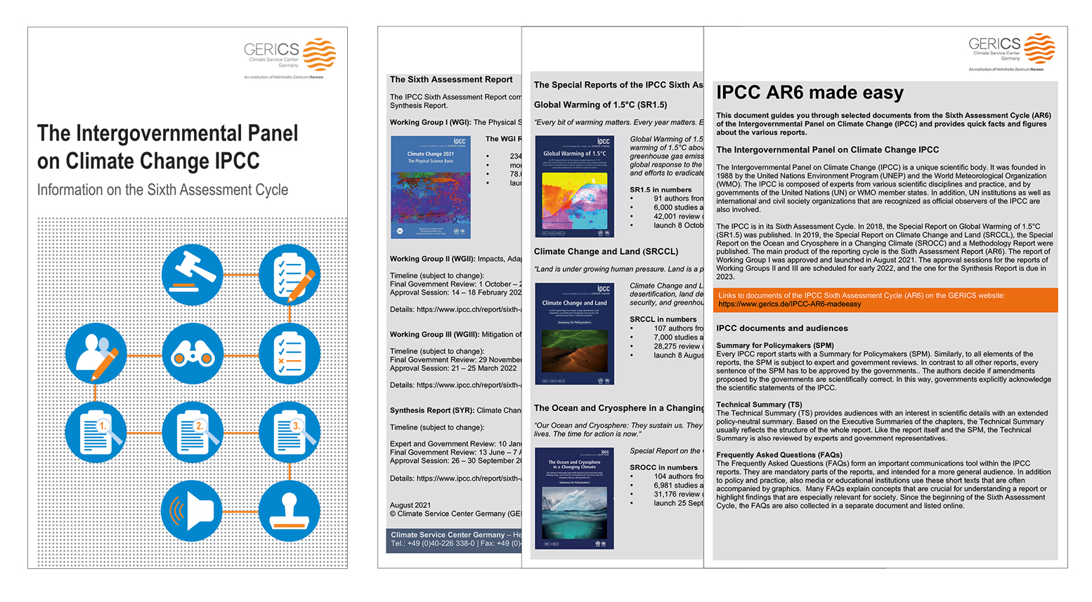 Two leaflets developed by GERICS help users navigate through the IPCC reports. They form a quick and easy entry point to those parts of the reports that are most relevant for practical decisions about climate change mitigation and adaptation. In addition, short texts shed light on the unique process that brings science and policy together to ensure the robustness and usefulness of the IPCC assessments for global climate action. Both documents are available in English and German. They are updated continuously to include information about forthcoming IPCC reports.