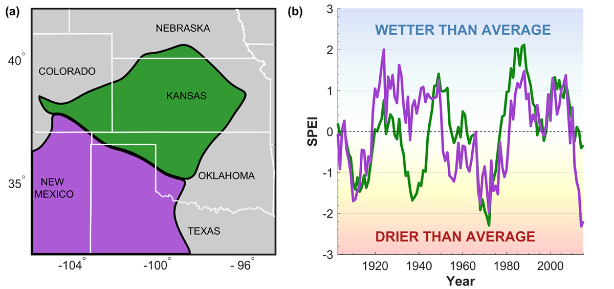 Zach Zambreski, a young, bright, dedicated meteorologist, tackled the problem of long-term drought dynamics in his graduate research (Kansas State University, Agronomy). He employed Empirical Orthogonal Functions (EOF, a type of principal component analysis) to characterise monthly drought metrics of the U.S. Great Plains over the 20th century (1903 to 2015). He then correlated the EOF with each of the localised time series of drought metrics to identify regions with similar historic patterns of wetting and drying cycles. Analyses such as this provide benchmarks against which climate change trends can be usefully compared.