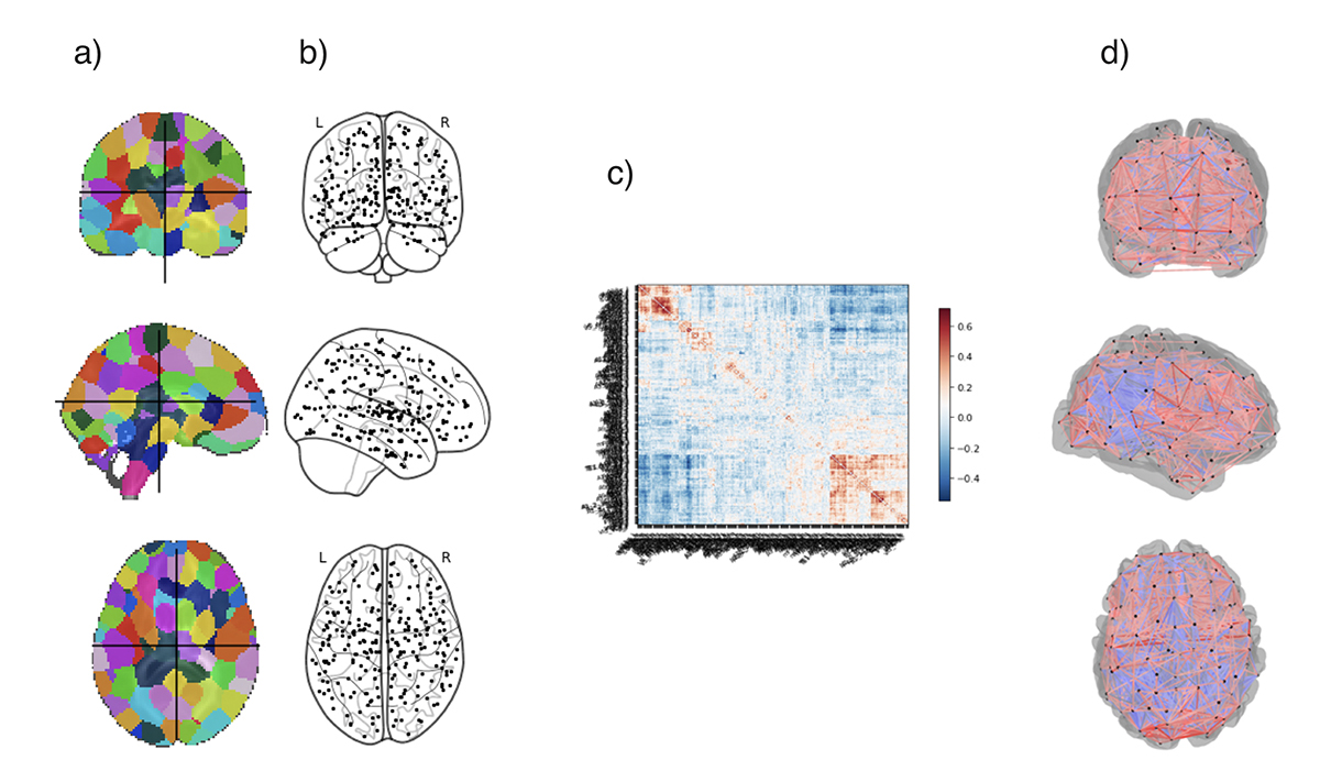 Figure 1 – Common process to create a network of the brain. Figure a) represents a human brain parcellation atlas which is a form of dividing the brain in anatomically and functionally distinct, spatially contiguous areas. Each node in figure b) represent a region of interest of the brain parcellation atlas. To define the edges, connections between the nodes, imaging modalities are used. The connectivity matrix in figure c) was obtained using fMRI images. Figure d) represents a brain network, in which the nodes are represented by black dots and the color of the edges represent edge weight.