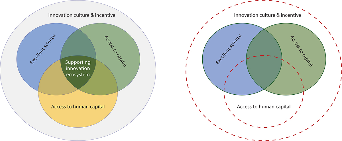 - Excellent science – no barrier perceived: Europe generates a great deal of world-class science. There is, therefore, no relative lack or absence of world-class science in Europe which hinders or presents a barrier to the development of a strong health innovation ecosystem. Europe and the Member States should strive to maintain or improve the existing strong commitment to fostering world-class science in order to ensure that a current strength is not allowed to deteriorate and become a weakness.