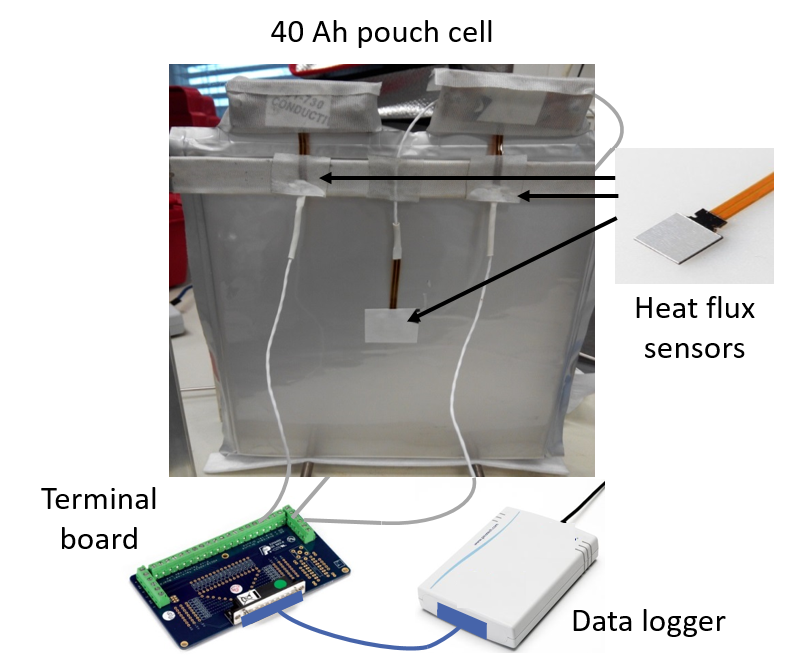 The thermal management of Li-ion batteries is becoming more and more important with increasing energy density because an uncontrollable increase in temperature (so-called thermal runaway) can cause an ignition or even explosion of the cell with a simultaneous release of toxic gases. In order to adapt the thermal management system to the individual needs of the cells, quantitative data of the thermal parameters are needed. It will be shown how heat flux sensors can be used to provide: i) Values for the specific heat capacity; ii) Heat transfer coefficients for the different sides of a cell and; iii) Values for the generated heat. A thermopile based Heat Flux Sensor is composed of tiny, serially connected semiconductor piles sandwiched between two flat surfaces, forming the sensor. Any heat flux passing through the sensor creates a temperature difference due to the Seebeck effect, which produces a voltage difference proportional to the heat passing through the surface. This voltage difference on different areas of a Lithium-ion cell is read out using a data logger, which is attached to a terminal board connecting the wires coming from the sensors (see Fig. 1). Depending on the sensor’s sensitivity, the resulting values are converted into heat flux. A HFS can detect all three possible types of heat transfer: convection, conduction and radiation.
