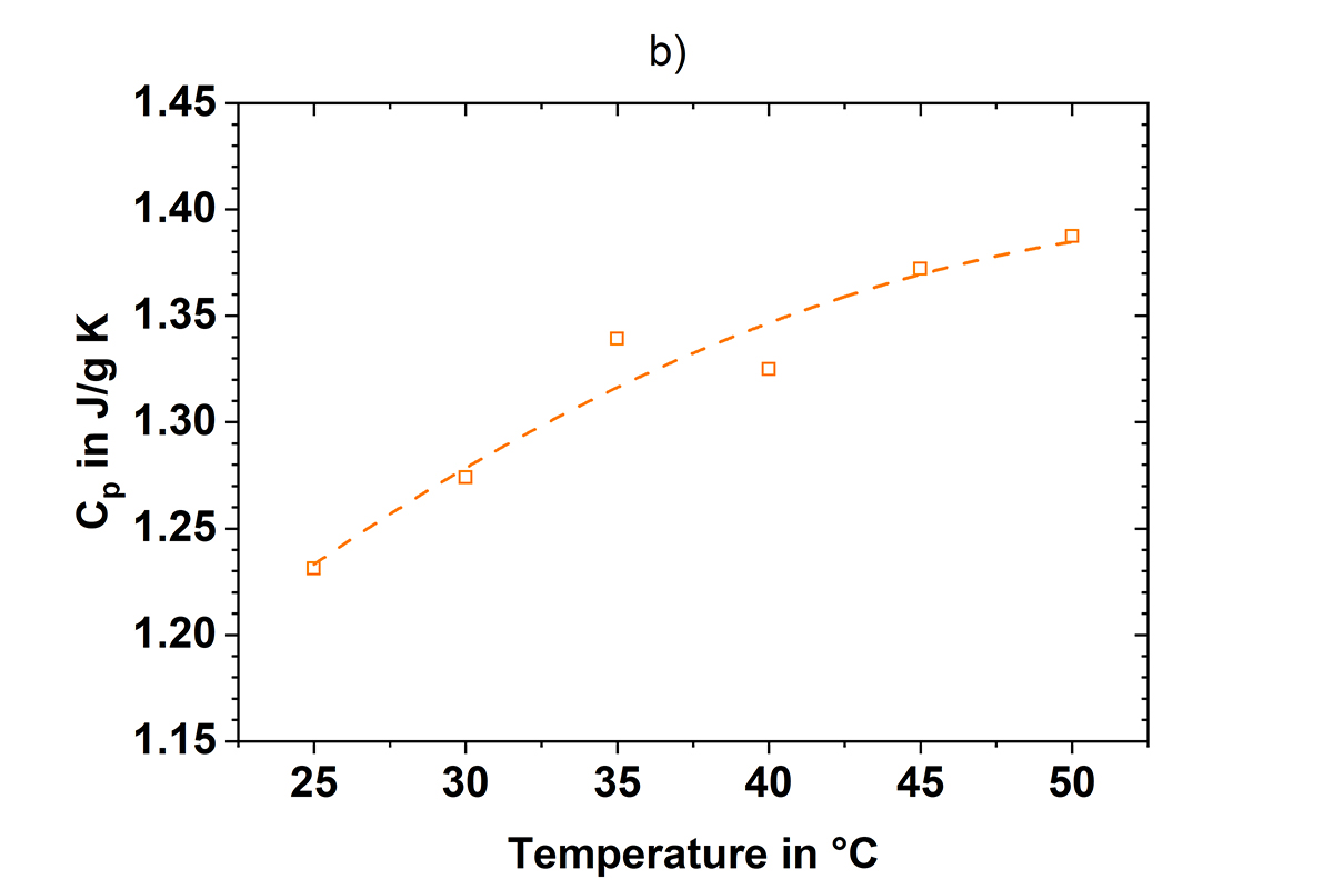 To measure the effective specific heat capacity Cp of a Lithium-ion cell, a HFS is attached on its surface and the heat flux response and a series of temperature steps are recorded, as shown in Fig. 2a). Integration of the peak areas and division by the cell mass gives the effective specific heat as a function of temperature (s. Fig. 2b)).